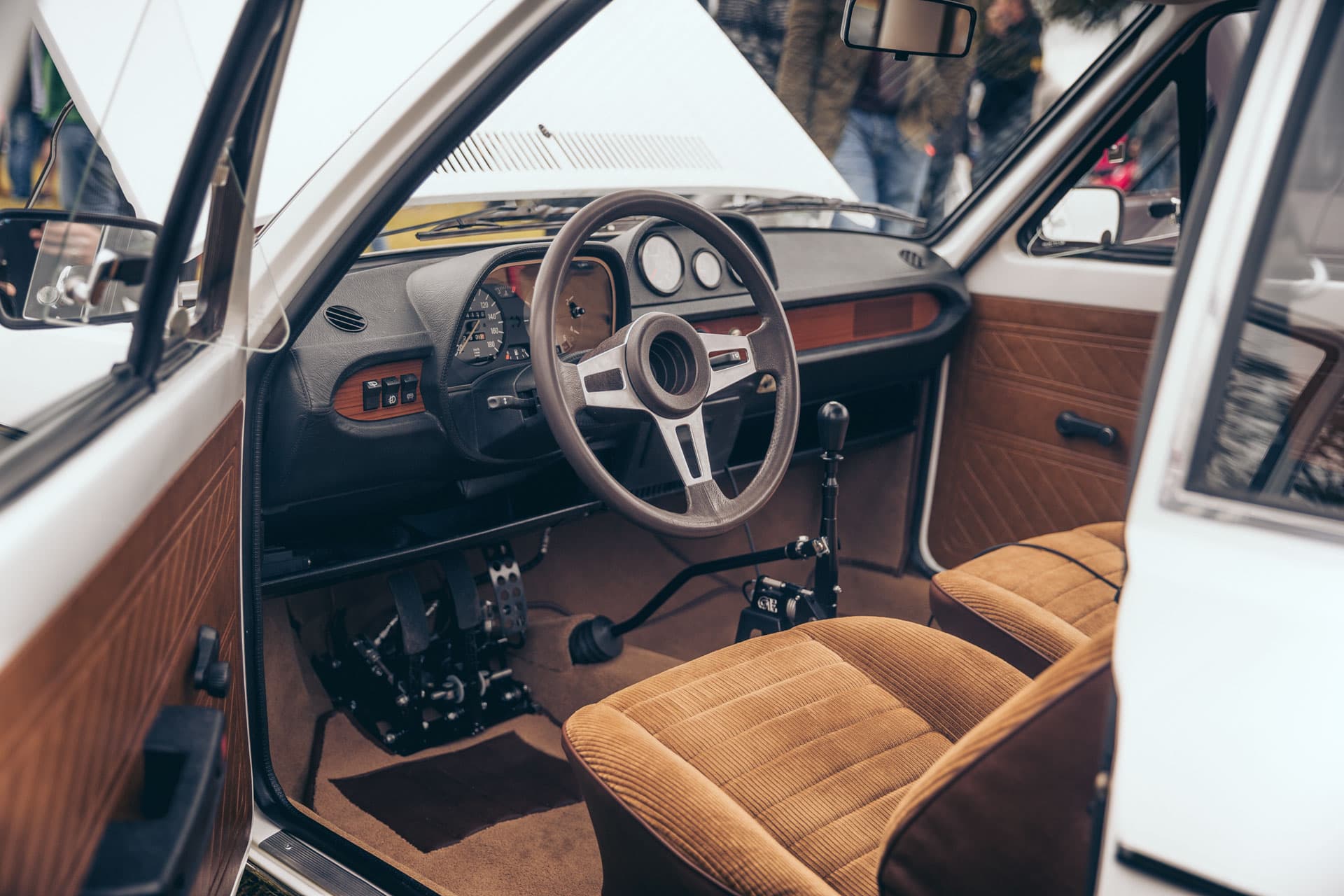 Inside the car the “purist” theme continued, featuring a factory corduroy cloth interior and MK1 Scirocco steering wheel, all working in strange harmony with a CAE Ultrashifter and Tilton pedal box.