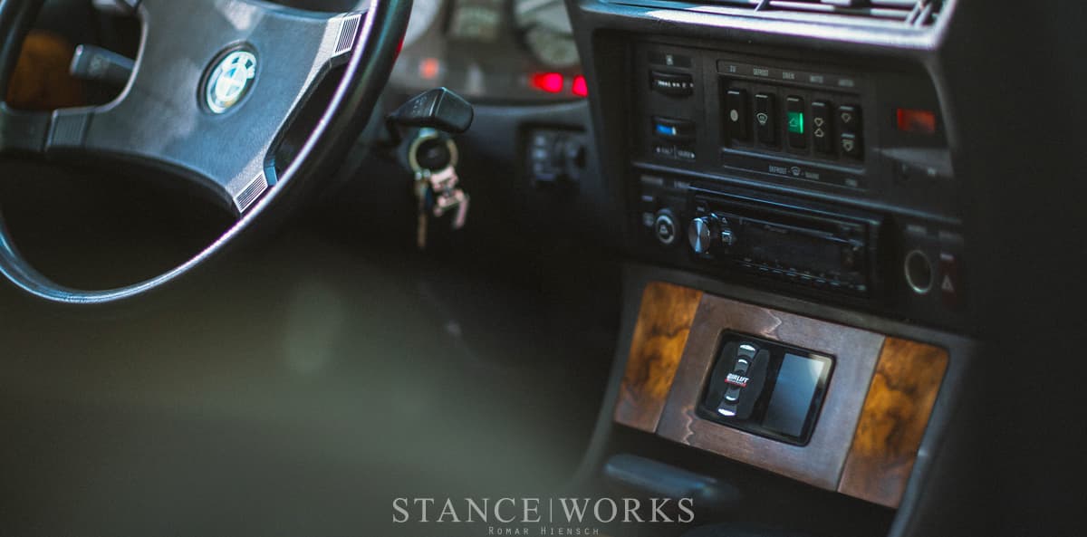 Utilising Air Lift Performance’s 3H air management system, the BMW’s ride remains silky smooth – even when hugging the ground – thanks to our 3H height sensors, which constantly monitor and adapt the ride height and pressure on the move. What’s more, Denis can quickly and easily raise the E23’s ride height right from his center console, at the touch of a button, to clear even the biggest road obstacles.